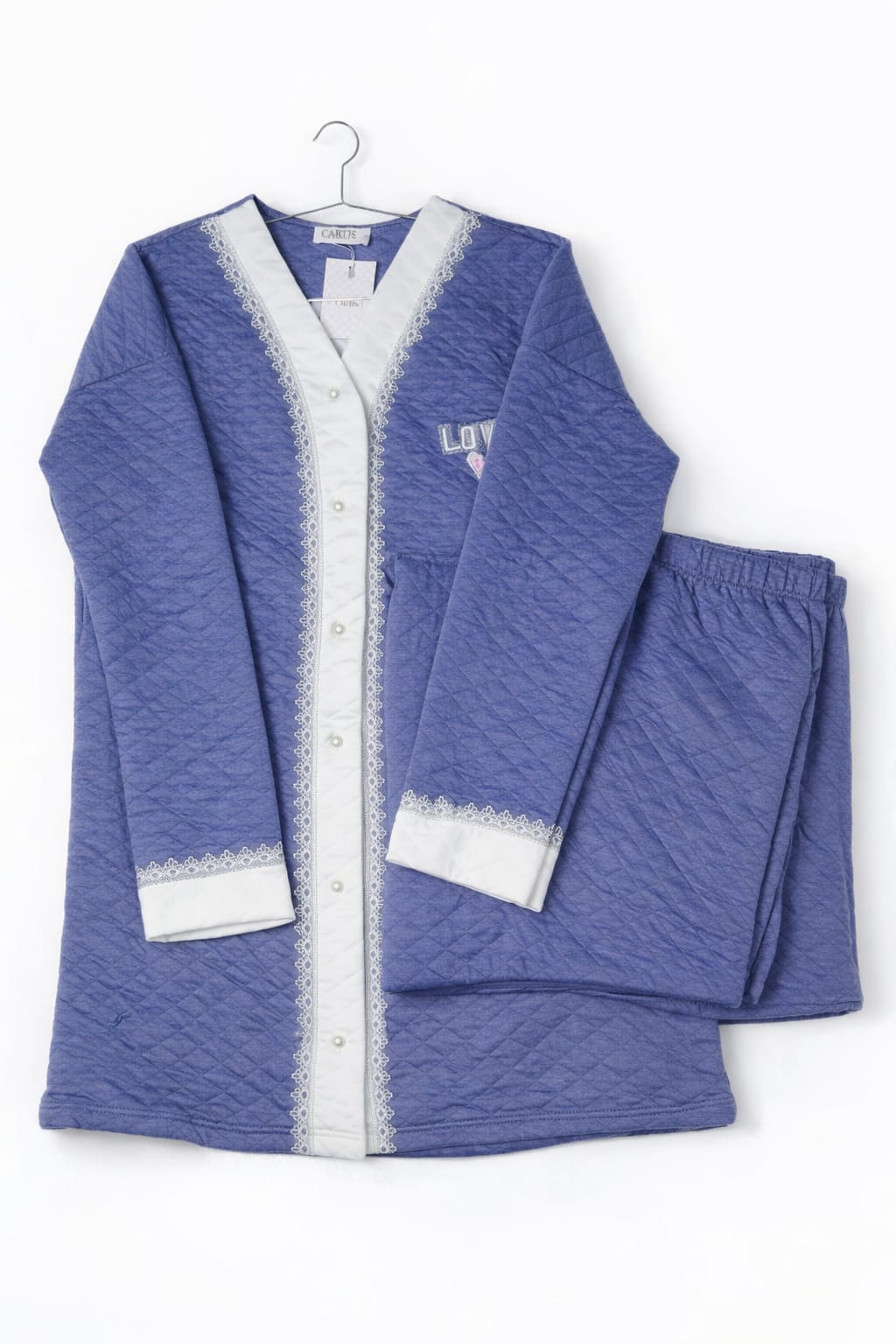 Pyjama femme matelassé manches longues en bleu denim avec bordures en dentelle blanche, boutons nacrés et broderie « Love ». Livré avec pantalon assorti à taille élastiquée.